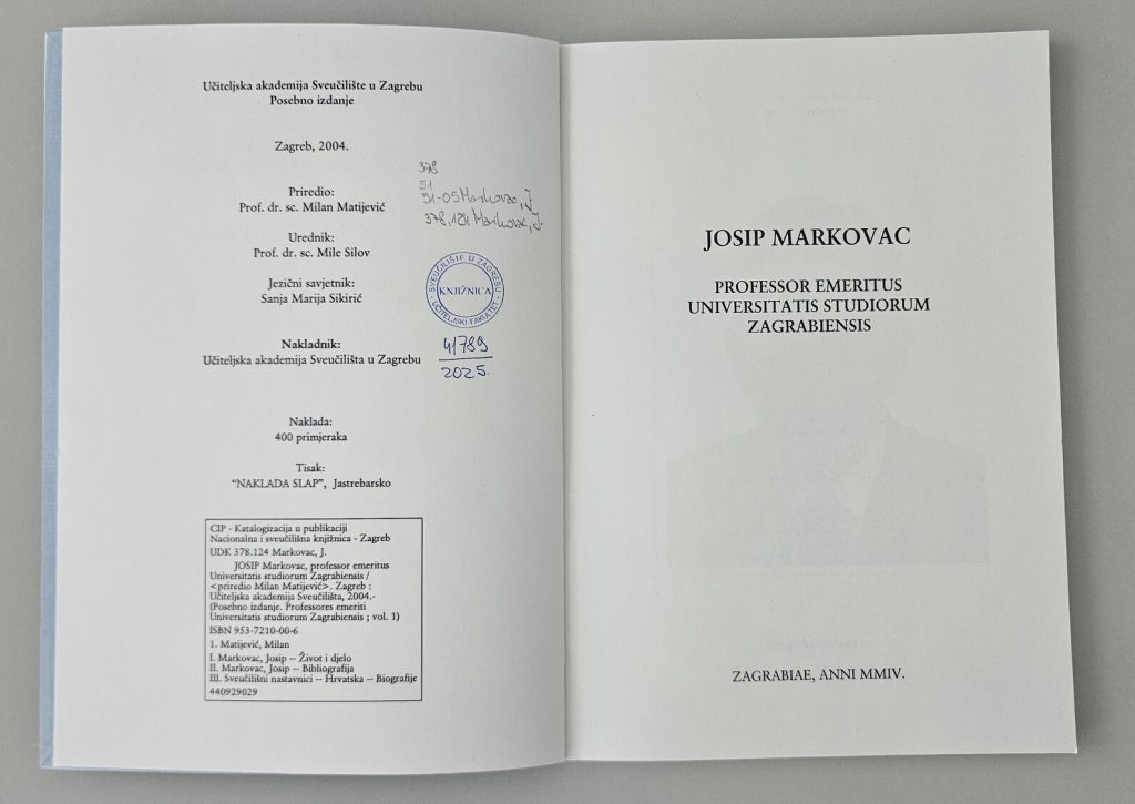 Josip Markovac, Professor Emeritus Univeritatis studiorum Zagrebiensis priredio Milan Matijević, Zagreb: Učiteljska akademija Sveučilišta, 2004.