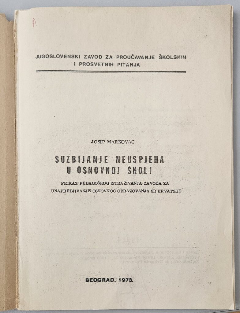 Markovac, Josip : Suzbijanje neuspjeha u osnovnoj školi, prikaz pedagoškog istraživanja Zavoda za unapredjivanje osnovnog obrazovanja SR Hrvatske, Beograd, Jugoslavenski zavod za poučavanje školskih i prosvetnih pitanja, 1973.