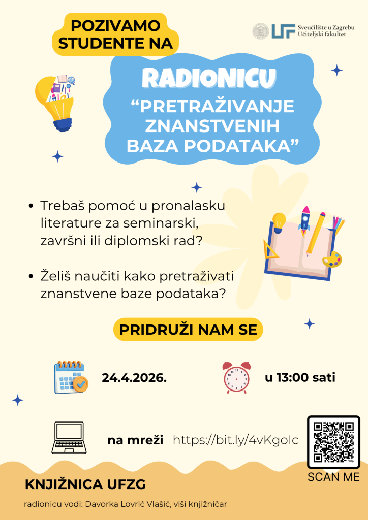 pozivamo vas na radionicu „Pretraživanje znanstvenih baza podataka“, koja će se održati u petak, 24. travnja 2026. godine u 13:00 sati u online obliku. Radionica je namijenjena svim studentima koji žele unaprijediti svoje vještine pronalaženja i korištenja stručne i znanstvene literature.