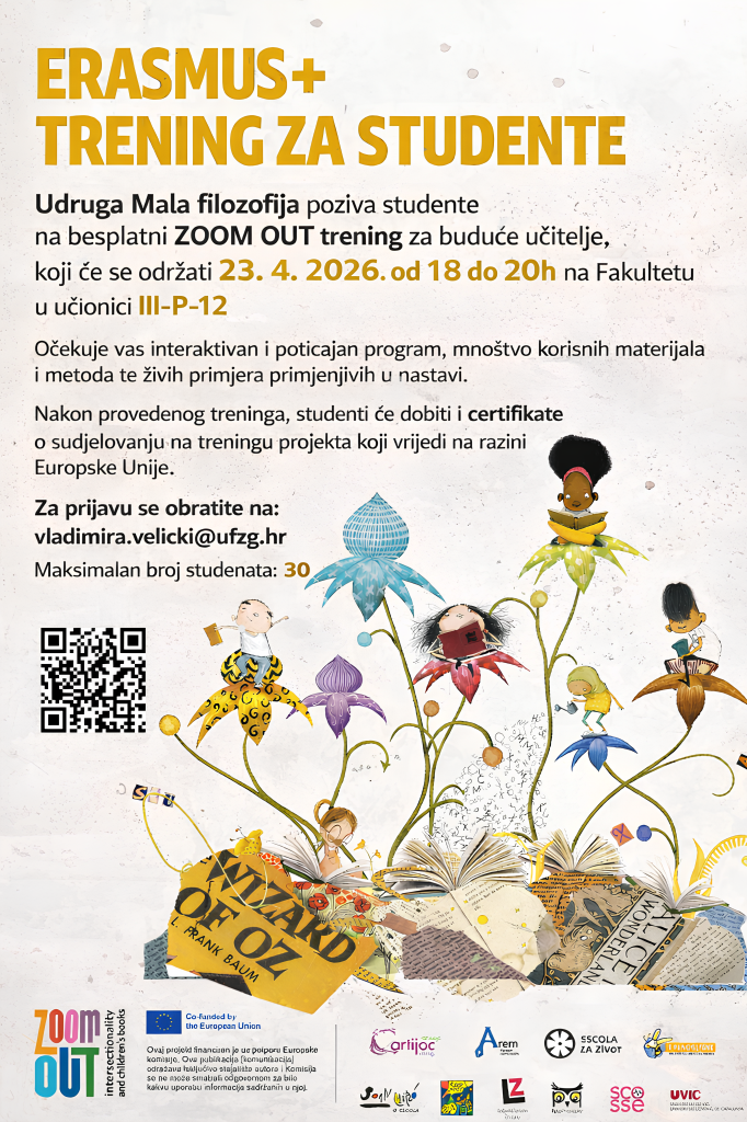 Udruga Mala filozofija poziva studente na besplatni ZOOM OUT trening za buduće učitelje, koji će se održati 23. 4. 2026. od 18 do 20h, na Učiteljskom fakultetu, u učionici III-P-12.