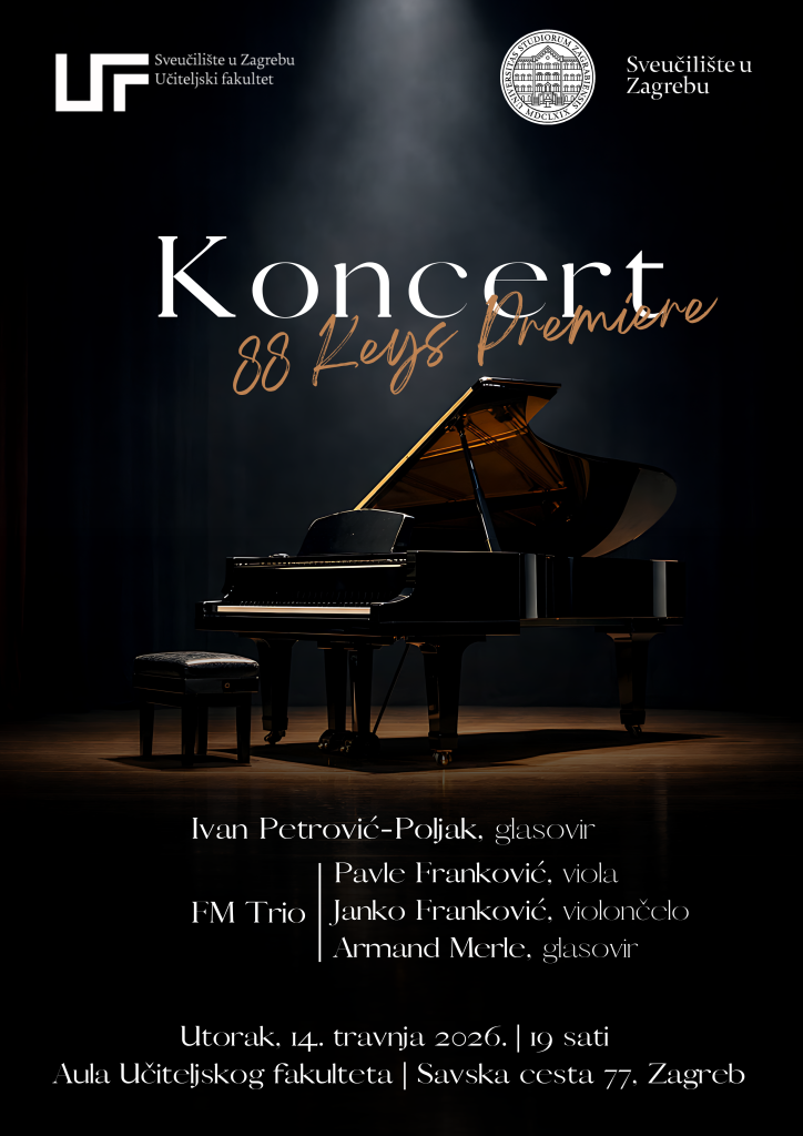 Srdačno Vas pozivamo na koncert „88 Keys Premiere“, koji će se održati u utorak, 14. travnja 2026. godine u 19 sati, u Auli Učiteljskog fakulteta Sveučilišta u Zagrebu (Savska cesta 77).