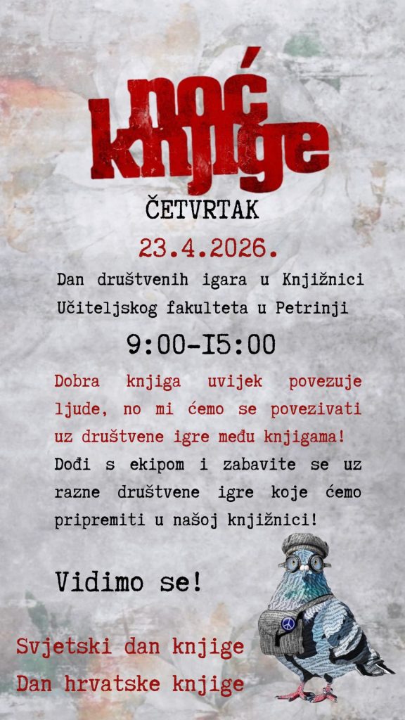 Pozivamo studente na Dan društvenih igara u Knjižnici Učiteljskog fakulteta Odsjeka u Petrinji koji će se održati 23. travnja 2026. godine u vremenu od 9:00 do 15:00 sati.