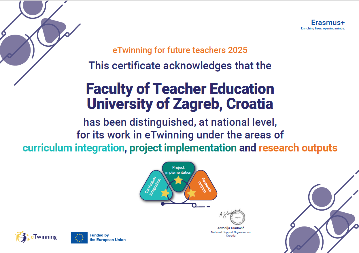 Učiteljski fakultet Sveučilišta u Zagrebu dobitnik je nacionalnog priznanja za rad sa studentima u eTwinningu u područjima integracije kurikula, implementacije projekata i znanstvenih isporučevina za 2025. godinu.
